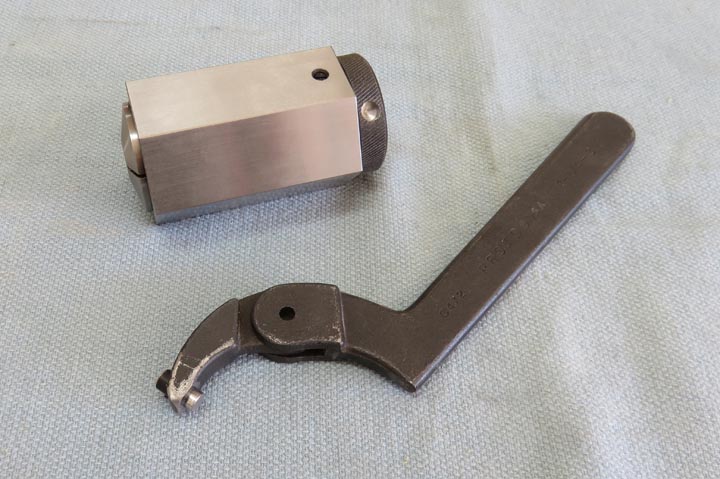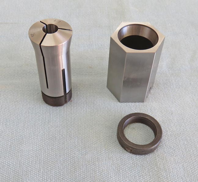 This hexagon collet holder should work great in my three jaw chuck. The round black piece in back of the collet holder is a nut that tightens down the collet. And the spanner wrench tightens the nut.