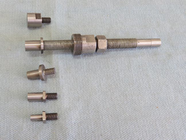 What you see below is a collet stop that I made many many years ago. This only works with 5-C collets and is adjustable. And I also made some threaded pieces of various sizes to accommodate different diameter work pieces. The one that is threaded in the collet holder is 1/2" diameter, which is what I need for my project.