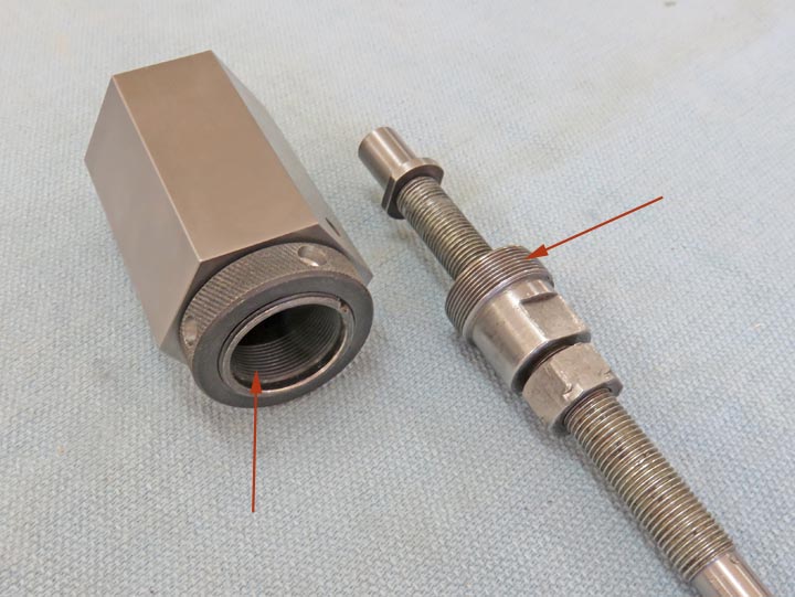 The large thread on my collet stop threads into the back of the collet (arrows). Then you can adjust the long threaded piece in or out of the collet to whatever depth you need. Once you have the depth set, you tighten the jam nut and you're ready to machine some parts.