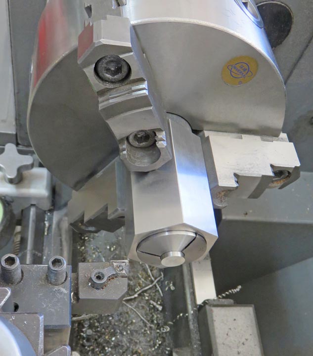 Here is what the business end of the set-up looks like. Now I can machine each part to the exact same length. But I have to remove the hex holder each time I do that, which is no big deal for this amount of parts.